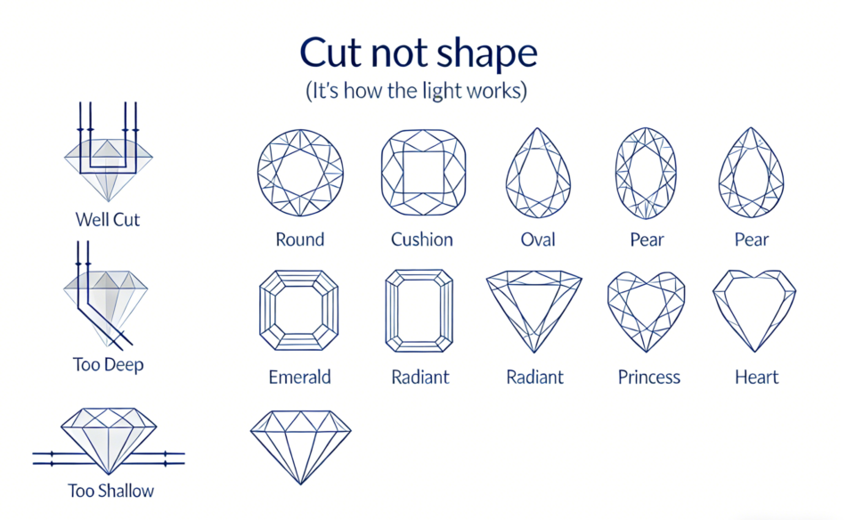 Cut quality is often misunderstood. Sapphire cut does not refer to shape (oval, round, emerald) — it refers to how well the stone is proportioned and faceted.