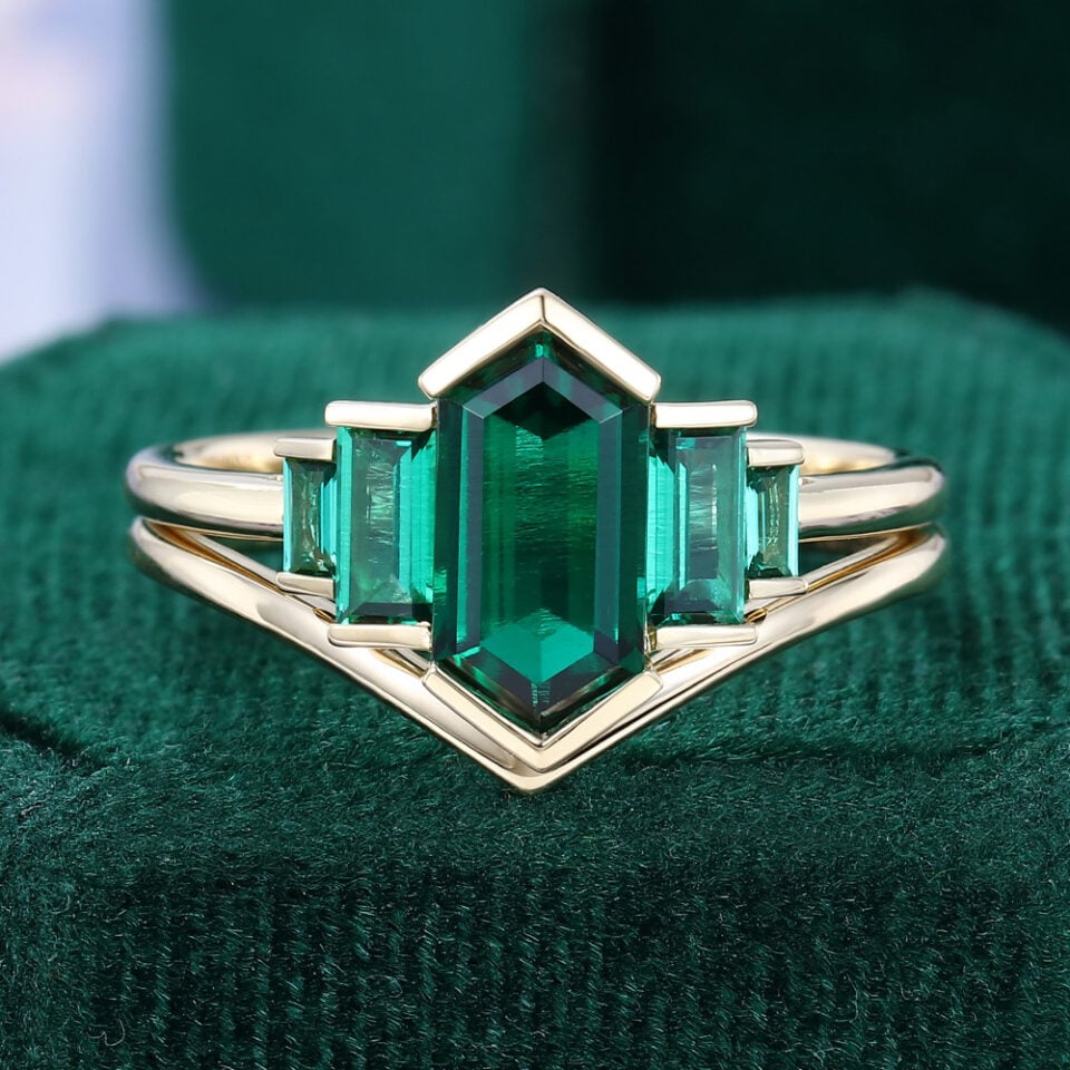 Oval Cut Lab Emerald Engagement Ring Set Vintage Marquise Engagement Ring Women Yellow Gold Wedding Bridal Promise Ring Set