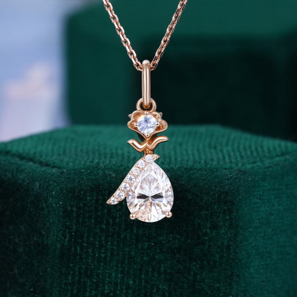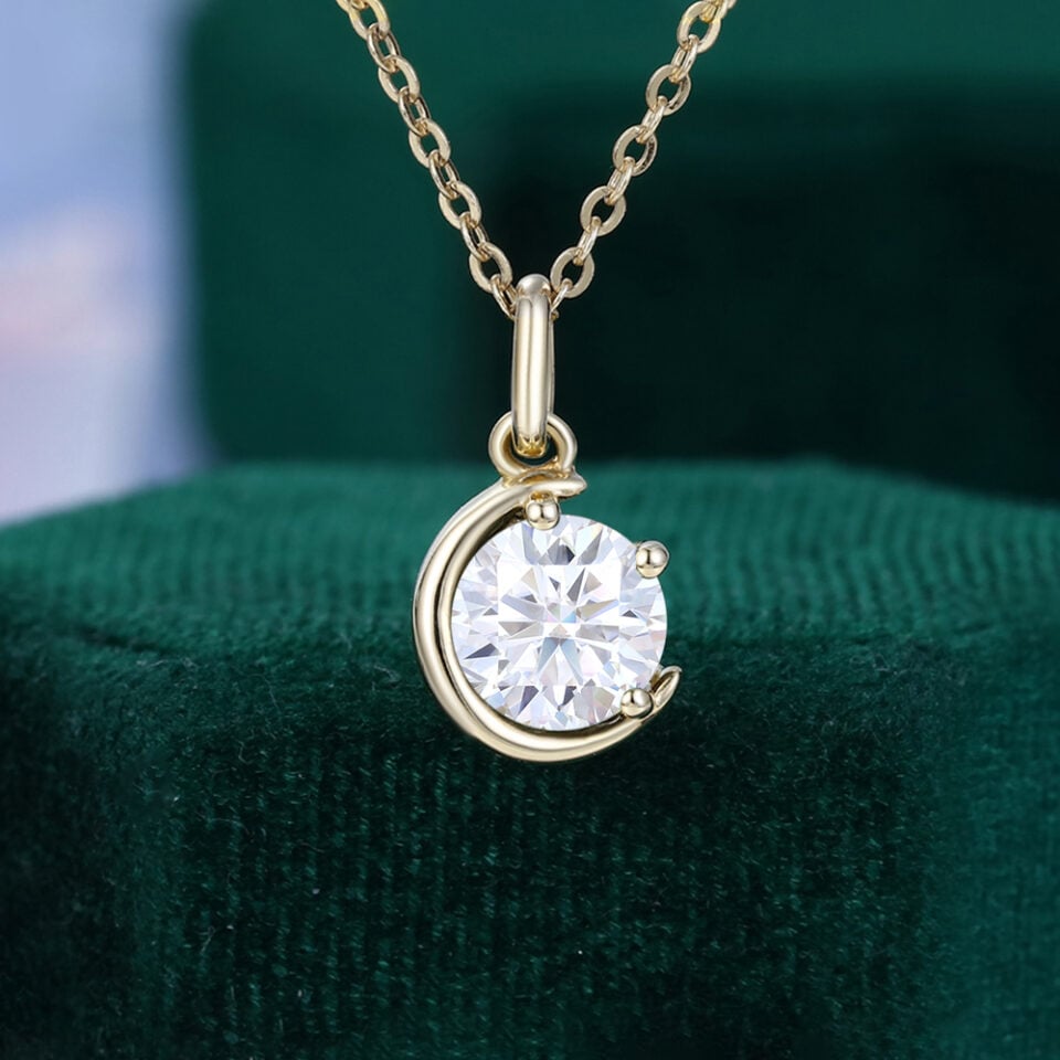 There’s something uniquely enchanting about a single, perfect drop of light. Our collection of moissanite necklaces is designed to be that stunning finishing touch you’ve been searching for. Each necklace features a lab grown gemstone with a brilliance and fire that rivals a diamond, but at a fraction of the price. Moissanite offers visual appeal, durability, and ethical sourcing that make it a compelling alternative to traditional diamonds. Our necklaces are ready for immediate purchase, making it easy to instantly elevate your wardrobe. The collection includes elegant moissanite pendants, known for their versatility and timeless sophistication.. They can be styled effortlessly for both day and evening, making them suitable for any time. With unmatched affordability and sustainability, our moissanite jewelry is the perfect choice for anyone who values both luxury and a conscious purchase.