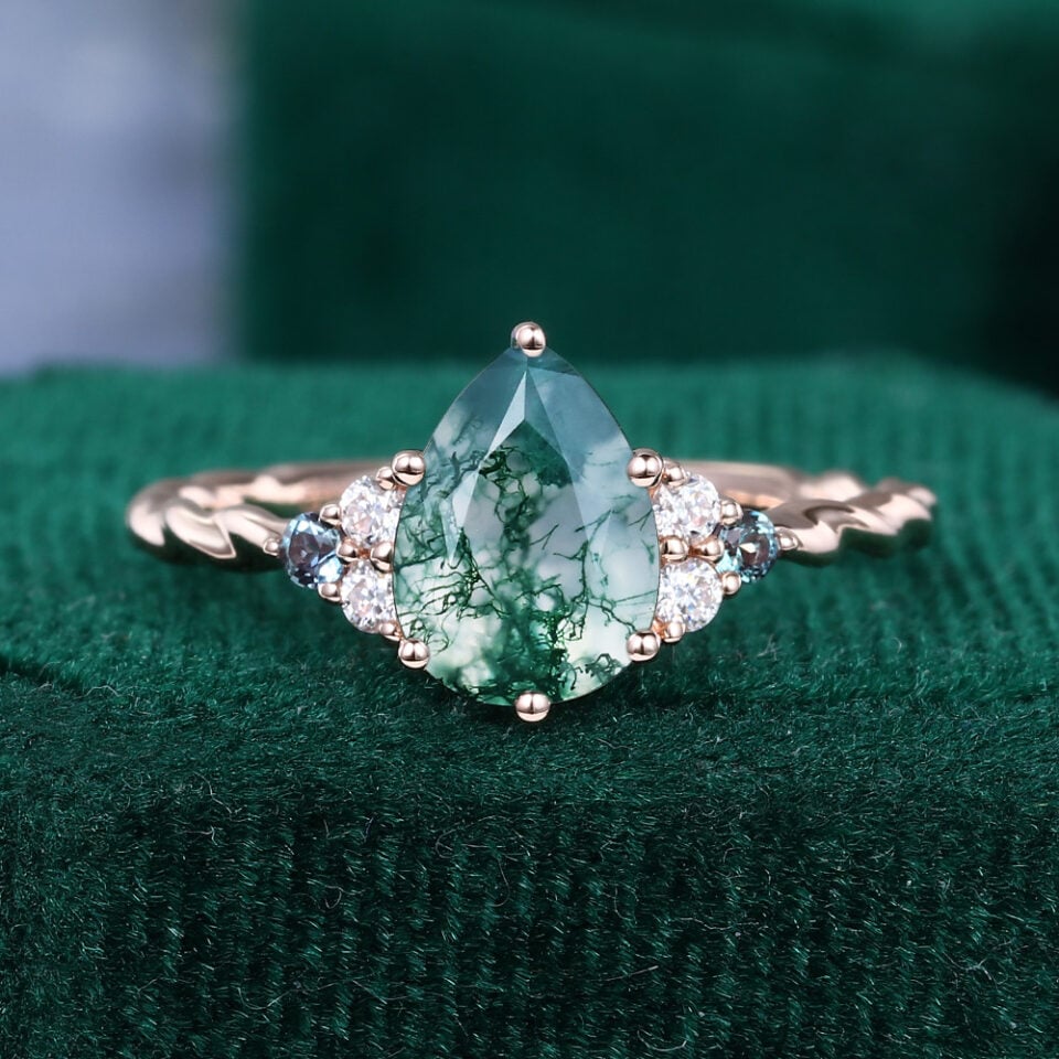 Welcome to our enchanting moss agate rings collection, browse through a collection of moss agate designs—solitaire, cluster engagement rings, ring set options, and wedding bands infused with organic textures. Whether you’re drawn to nature-inspired, vintage art deco, or minimalist style, you’ll find the perfect choice to reflect your commitment, style, and emotional balance.